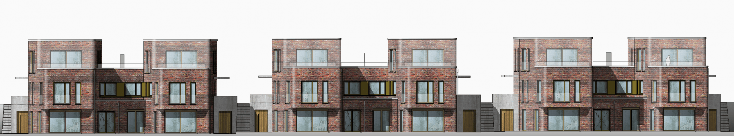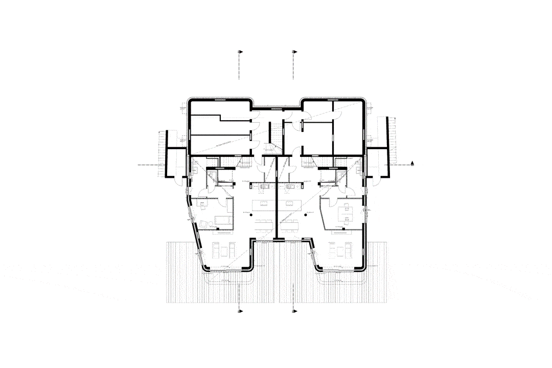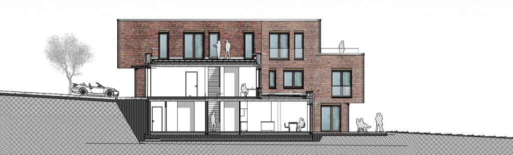 Die besondere uferseitige Lage an der Wakenitz definiert die Baukörpergestaltung: schlanke, langgestreckte Volumen, die sich zur Wakenitz hin öffnen und durch ein zusätzliches Gartengeschoss einen starken Bezug zum Wasser herstellen. Private Gartenflächen in Richtung Ufer werden durch Natursteinmauern eingefasst und bieten eine hohe Aufenthaltsqualität. Die drei Villen sind leicht zueinander verdreht angeordnet, um eine Rhythmisierung im Landschaftsraum zu erzeugen und die vorhandene Topographie optimal einzubinden. So entstehen abwechslungsreiche Außenräume und ein harmonisches Zusammenspiel mit der Natur.