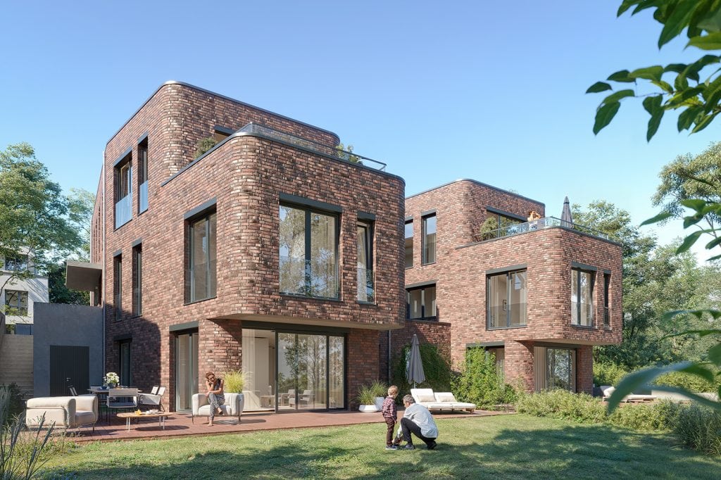 Die Architektur der Wakenitz-Villen verbindet hanseatische Bautradition mit einem klaren, modernen Designansatz. Die Baukörper orientieren sich in ihrer Materialität an den historischen Gebäuden der Umgebung: hochwertiger rot-bunter Klinker, klare Linien und große Glasflächen prägen das äußere Erscheinungsbild.